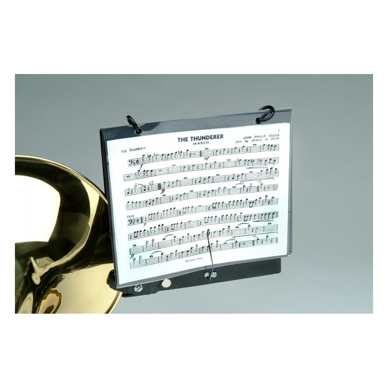 The DEG Trombone lyre clamps on any trombone bell rim and holds your music confidently in place, even in the most demanding conditions. The clamp is made of a slip-resistant, non-scratching material that will not harm your instrument.