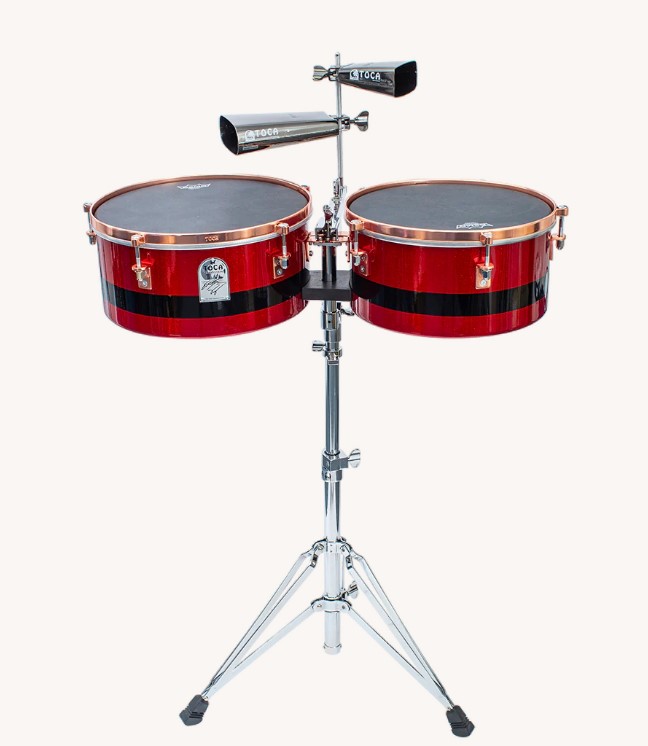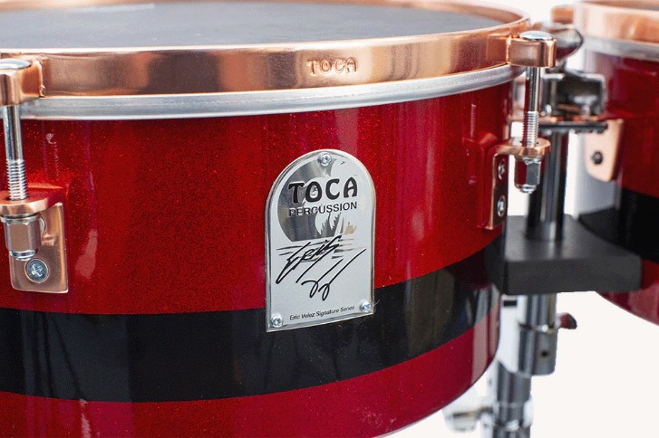 The Eric Velez Signature Series steel-shell timbales feature 14- and 15-inch heads, adorned with a striking Cranberry Red Glitter finish. These timbales feature black Remo synthetic heads, a sturdy adjustable stand, and an adjustable cowbell mounting bracket. The interplay of stage lights on the special glitter and rose gold hardware provides a mesmerizing visual spectacle. To unify the series, a black band around the belly of each timbale harmonizes with the black chrome band around the center of each conga. The timbale shell also produces a believable cascara sound.