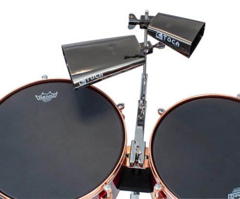 In particular, we have improved the cowbell mounting bracket, or timbale mounting arm, elevating its position among the drums. This modification streamlines the locking process with a single screw, minimizing the risk of finger and knuckle pain associated with tightening the nut in tight spaces. All of this is supported by a fully adjustable bracket.
