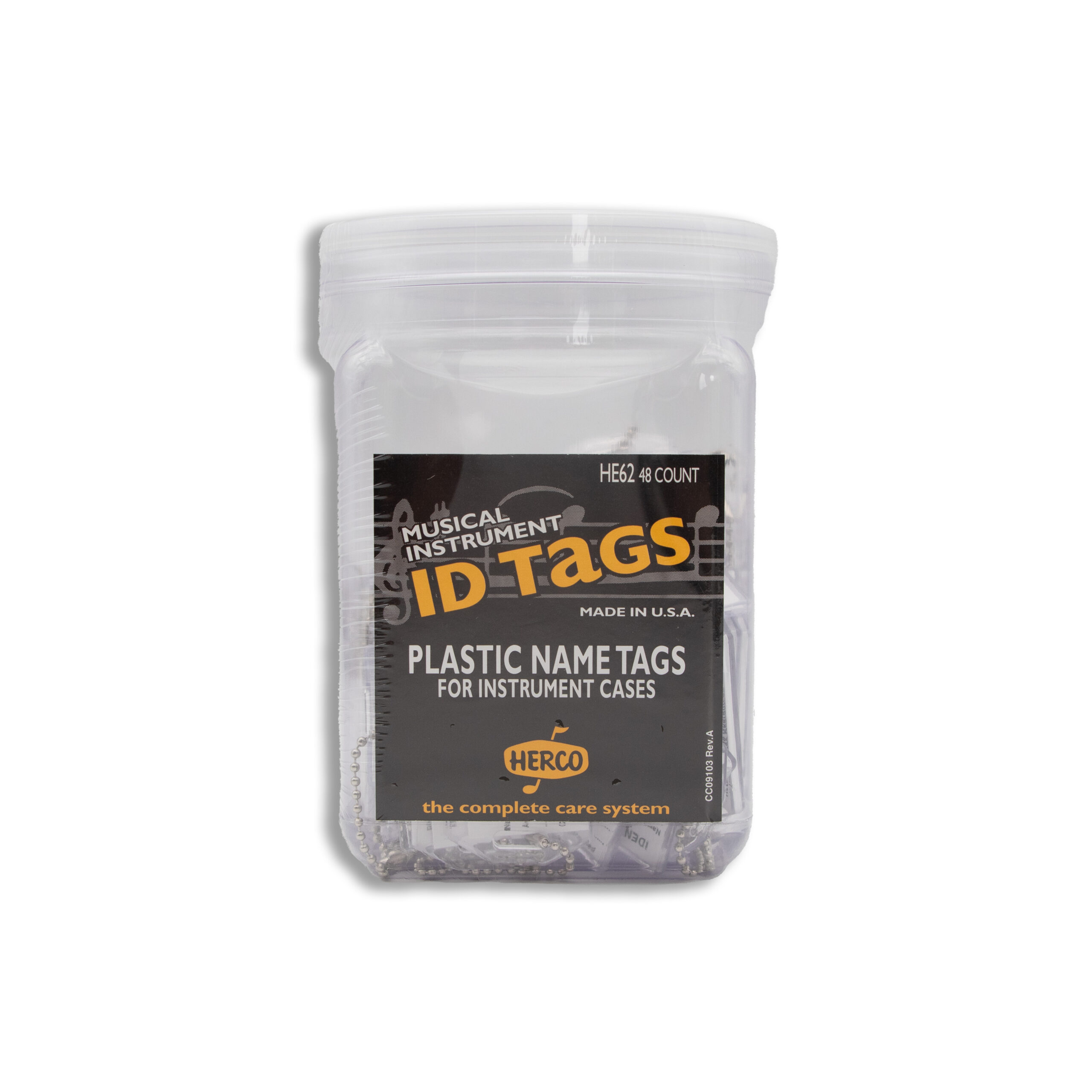 This bulk jar contains 48 Herco Plastic I.D. Tags, ideal for labeling instruments, cases, and accessories in educational and rental environments. Each tag is made from sturdy plastic and comes with a looped strap for secure attachment. Use them to assign ownership, inventory items, or track gear across ensembles and classrooms. A practical solution for keeping organized in busy school programs, repair shops, or touring setups.