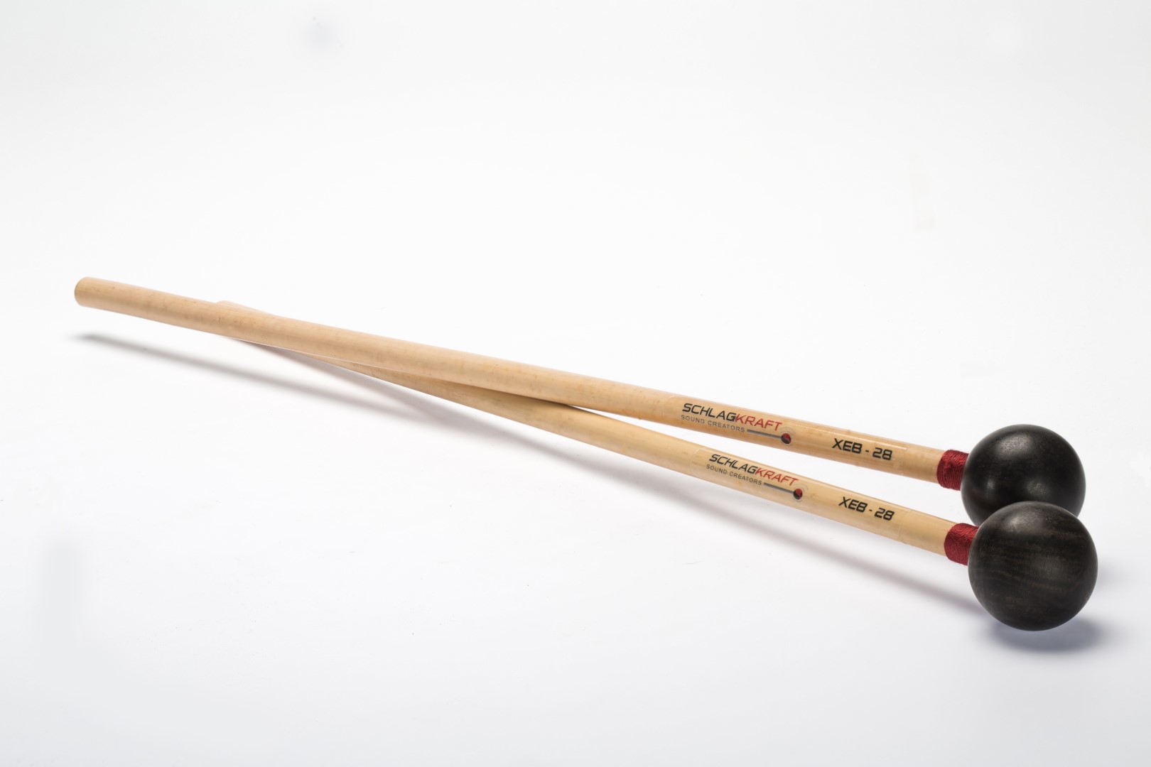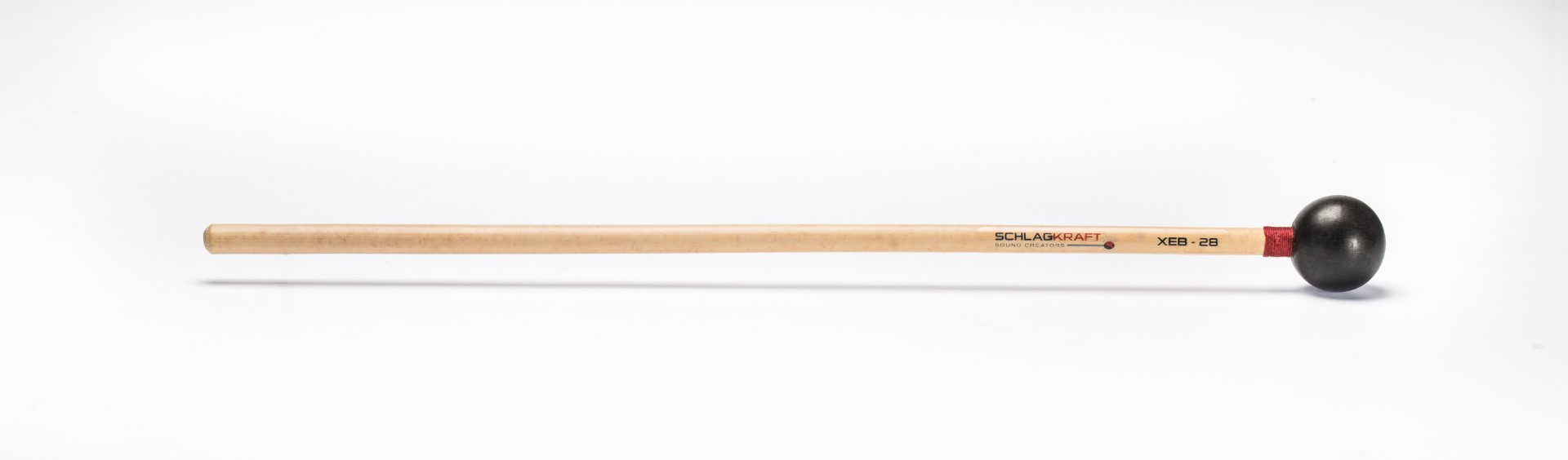 Pure xylophone sound. Highest-quality ebony wood, purchased from a traditional German string maker. Black ebony heads are the heaviest and purest woods available. Expensive and difficult to find, the heads are made from select square rods. Ebony is a hardwood with a dense structure. After experimenting with various sizes, we selected 28 mm as an ideal combination of balance, weight, and overall feel. The XEB-28s are built as professional mallets of the highest quality, but their qualitative value will only be appreciated when a pure wood sound is desired. The XEB-28 has a strong, crisp, woody, and full sound. 28 mm also contributes positively to piano playability by producing the greatest possible fundamental sound. Perfectly crafted, finely hand-sanded, and waxed. Rattan is hand-wrapped with burgundy thread. This is a premium model exclusively for xylophones, just for lovers of the pure wood sound.